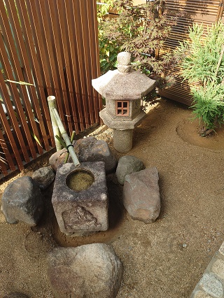 和の風情漂う露地庭。 つくばい石組や石灯籠、天然竹の筧など、